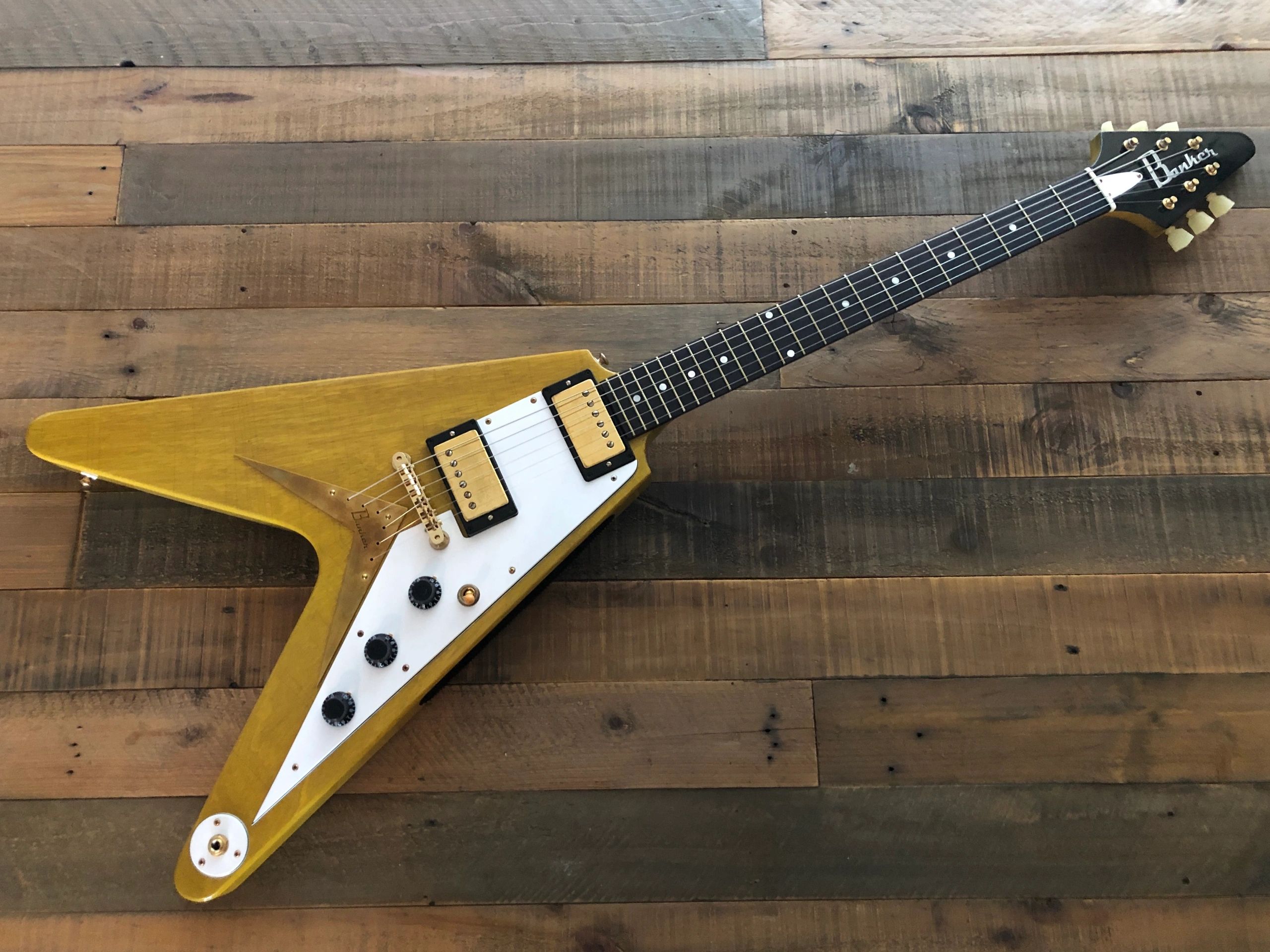 Banker Guitars are handmade in Northern Georgia by a single luthier, Matt Hughes. Matt employs the same construction techniques that were used in the 1950's which many consider to be the golden era of guitar building. Banker Guitars is licensed by Gibson to make faithful reproductions of iconic and rare guitars such as the '58 Korina Flying V and Explorer. Original examples have sold for hundreds of thousands of dollars, well out of reach of the average musician. Vintage guitars look, feel, and sound remarkable for a number of reasons, primarily how they were built and with what materials. By creating his instruments utilizing old growth tonewoods and period correct hardware through a one-man handmade shop, Matt has pushed the magic of vintage instrument ownership into the realm of possibility for the rest of us.